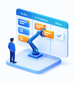 Agent automatically generates tasks, assigns members, and visualizes the updated status on the Dashboard instantly.