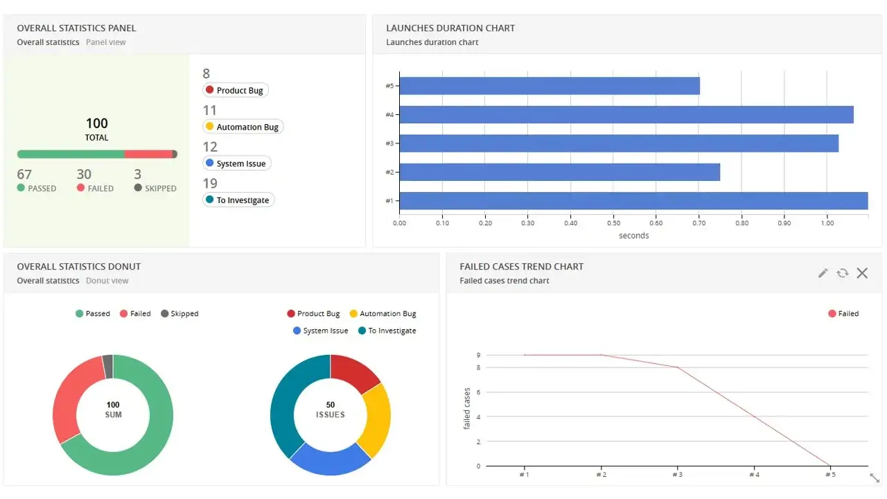 The solution integrates with various frameworks to automatically collect and visualize test results in dashboards and charts. It also auto-analyzes failures and classifies them into three major defect types: Product, Code Logic, and System.