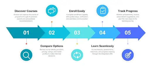 The Education Marketplace connects learners, providers, and trainers through an AI-powered ecosystem for discovering courses, creating content, managing training, and delivering learning experiences—all in a unified, integrated platform.