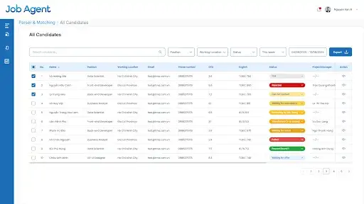 - Monitor candidate status throughout the recruitment lifecycle (N/A, Rejected, Can not contact, Waiting for submission, Reviewing by manager, Transferred CV to project, Waiting for result, Failed, Passed Round 1, Waiting for offer).