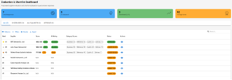 The Evaluation & Scoring module automates and standardizes supplier assessment using AI-powered, objective scoring models. Supplier responses, documents, and risk indicators are analyzed against configurable criteria and weighted scoring frameworks, ensuring consistent and unbiased evaluations.