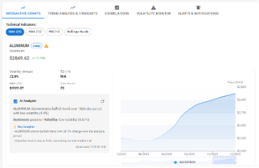 Commodity Analytics extends basic price tracking with advanced analytical capabilities. The module combines historical data, volatility analysis, and AI-powered forecasting models to identify trends, risks, and potential future scenarios. Interactive charts and automated insights support deeper analysis without manual modeling.