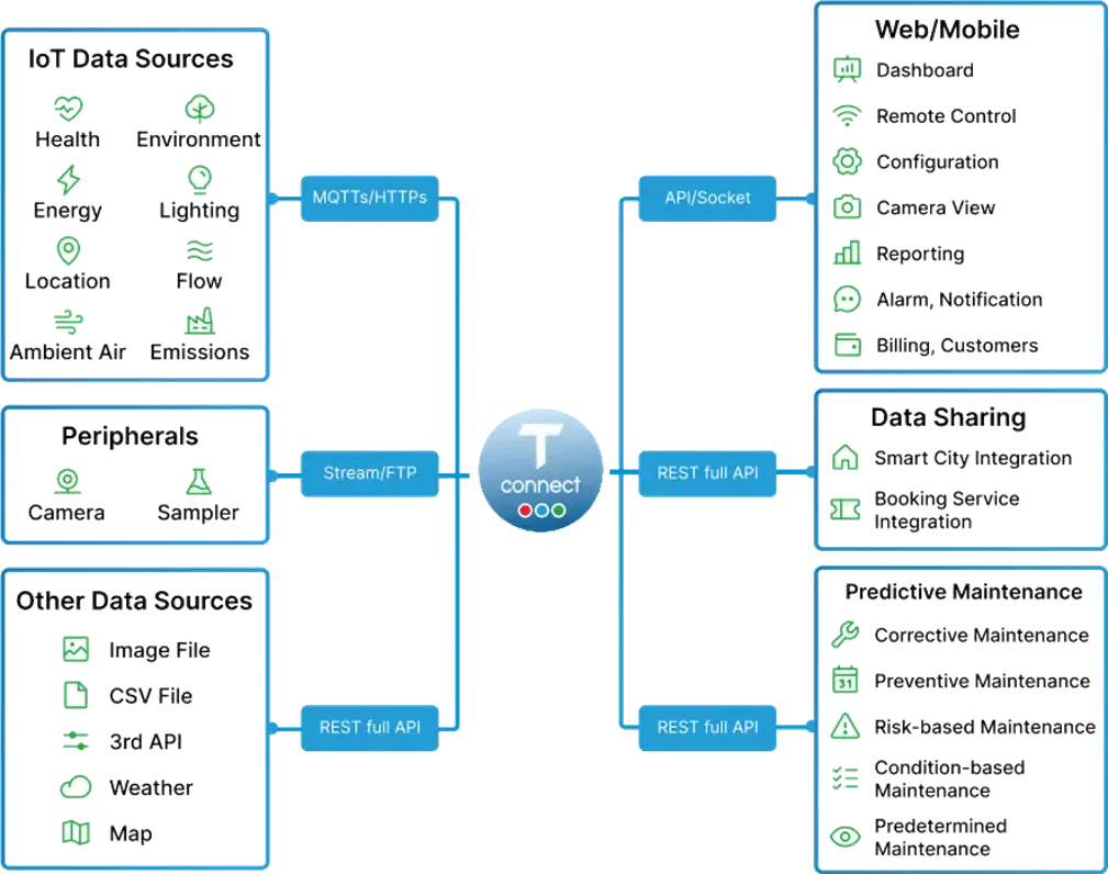 T-Connect is a flexible IoT platform supporting customers in real-time data collection and device control. Its core strength lies in its compatibility with diverse data sources (Health, Energy, Environment, Lighting, etc.) via MQTTS/HTTPS protocols and wireless connections such as LoRaWAN, 4G, and WiFi. With a highly customizable Dashboard and integrated AI, T-Connect enables the smart digitalization of asset management and maintenance processes.