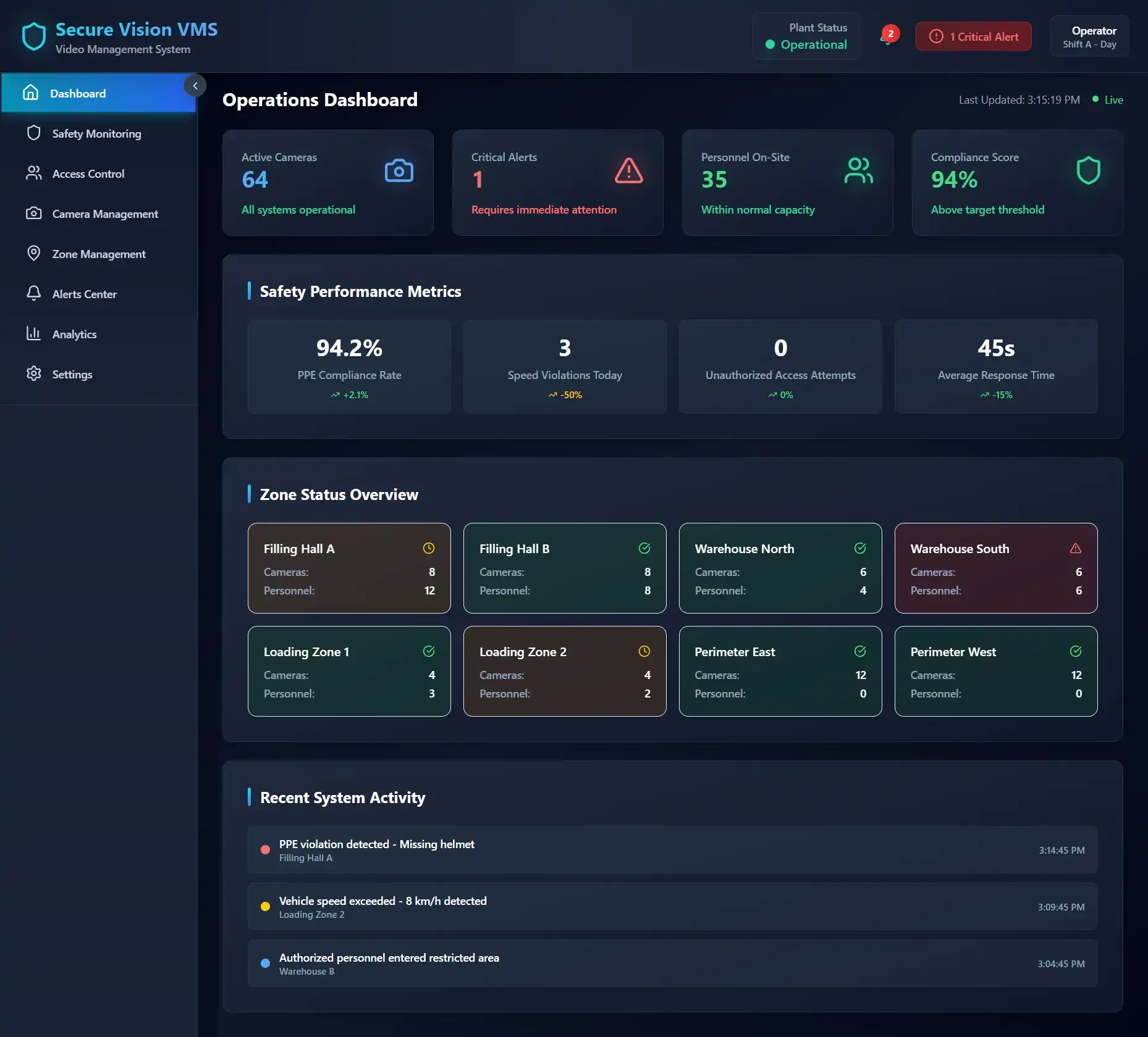 Provides a unified dashboard to monitor live camera feeds, manage access control using facial recognition, track active alerts, and oversee all operational zones from a single interface.